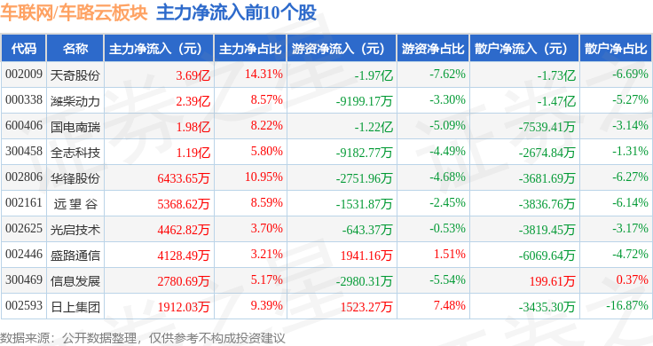 从资金流向上来看,当日车联网/车路云板块主力资金净流出65.04亿元,游资资金净流入13.52亿元,散户资金净流入51.52亿元。车联网/车路云板块个股资金流向见下表: