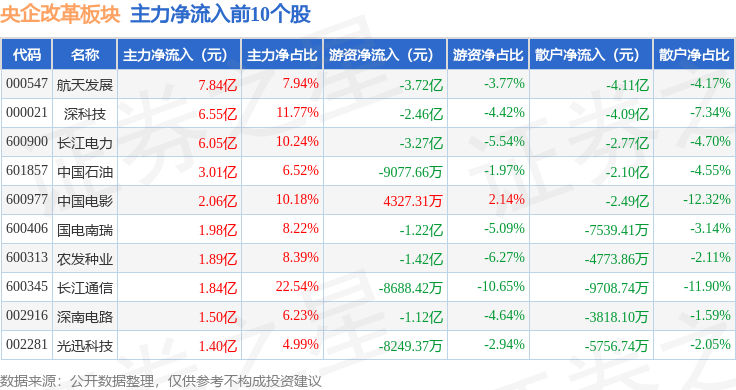 从资金流向上来看,当日央企改革板块主力资金净流出121.95亿元,游资资金净流入20.18亿元,散户资金净流入101.77亿元。央企改革板块个股资金流向见下表: