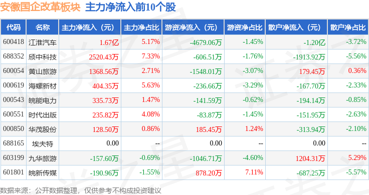 从资金流向上来看,当日安徽国企改革板块主力资金净流出20.41亿元,游资资金净流入5.4亿元,散户资金净流入15.01亿元。安徽国企改革板块个股资金流向见下表: