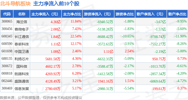 从资金流向上来看,当日北斗导航板块主力资金净流出32.26亿元,游资资金净流入3047.74万元,散户资金净流入31.95亿元。北斗导航板块个股资金流向见下表: