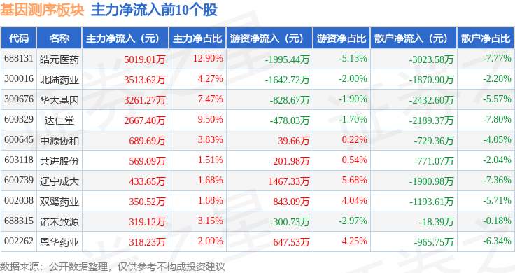 从资金流向上来看,当日基因测序板块主力资金净流出7.44亿元,游资资金净流入943.52万元,散户资金净流入7.34亿元。基因测序板块个股资金流向见下表: