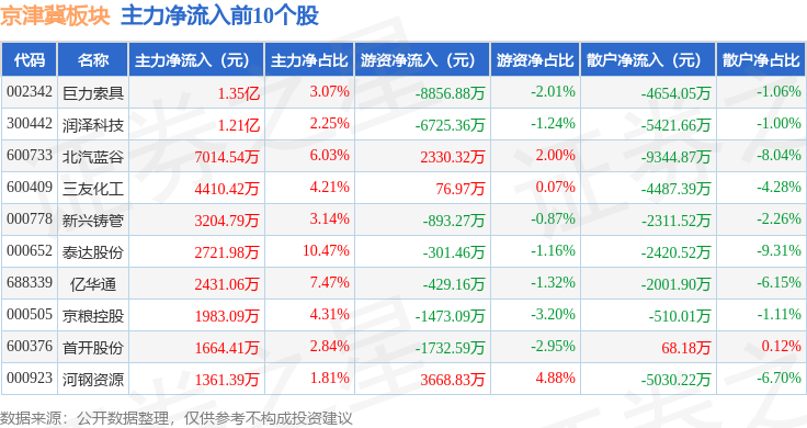 从资金流向上来看,当日京津冀板块主力资金净流出40.93亿元,游资资金净流入10.93亿元,散户资金净流入30.0亿元。京津冀板块个股资金流向见下表: