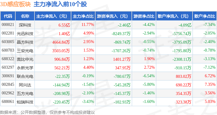 从资金流向上来看,当日3D感应板块主力资金净流出1.98亿元,游资资金净流出2.68亿元,散户资金净流入4.66亿元。3D感应板块个股资金流向见下表:
