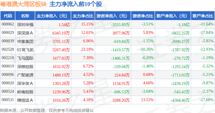 从资金流向上来看,当日粤港澳大湾区板块主力资金净流出12.15亿元,游资资金净流入4.35亿元,散户资金净流入7.8亿元。粤港澳大湾区板块个股资金流向见下表: