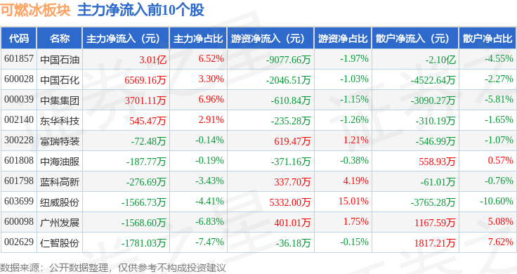 从资金流向上来看,当日可燃冰板块主力资金净流出9.96亿元,游资资金净流入1.1亿元,散户资金净流入8.86亿元。可燃冰板块个股资金流向见下表: