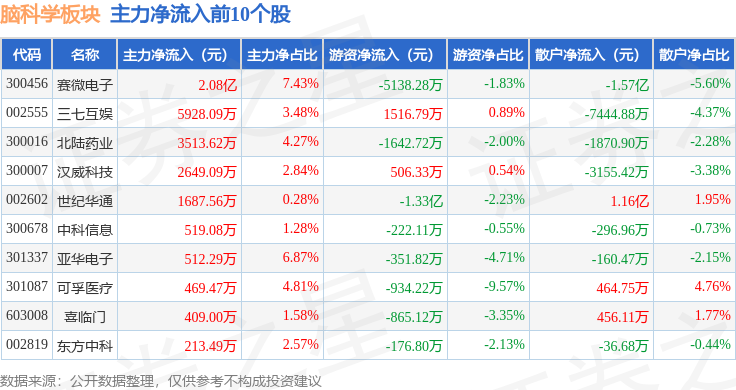从资金流向上来看,当日脑科学板块主力资金净流出39.71亿元,游资资金净流入2.27亿元,散户资金净流入37.45亿元。脑科学板块个股资金流向见下表: