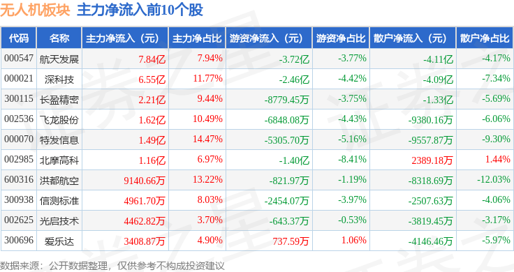 从资金流向上来看,当日无人机板块主力资金净流出33.69亿元,游资资金净流出4.44亿元,散户资金净流入38.13亿元。无人机板块个股资金流向见下表: