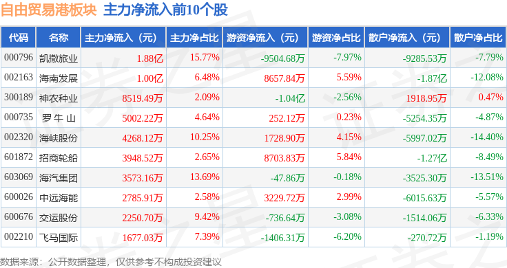 从资金流向上来看,当日自由贸易港板块主力资金净流出15.96亿元,游资资金净流入7.3亿元,散户资金净流入8.66亿元。自由贸易港板块个股资金流向见下表: