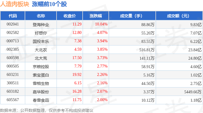 证券之星消息,1月30日人造肉板块较上一交易日上涨0.19%,登海种业领涨。当日上证指数报收于4117.95,下跌0.96%。深证成指报收于14205.89,下跌0.66%。人造肉板块个股涨跌见下表: