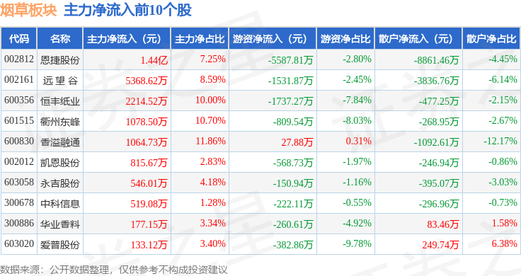 从资金流向上来看,当日烟草板块主力资金净流出1.39亿元,游资资金净流出4052.26万元,散户资金净流入1.79亿元。烟草板块个股资金流向见下表: