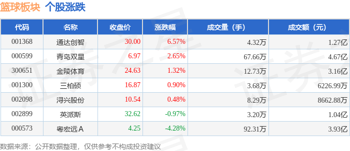 证券之星消息,1月30日篮球板块较上一交易日上涨0.5%,通达创智领涨。当日上证指数报收于4117.95,下跌0.96%。深证成指报收于14205.89,下跌0.66%。篮球板块个股涨跌见下表: