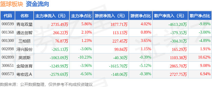 从资金流向上来看,当日篮球板块主力资金净流出2079.31万元,游资资金净流入514.06万元,散户资金净流入1565.25万元。篮球板块个股资金流向见下表: