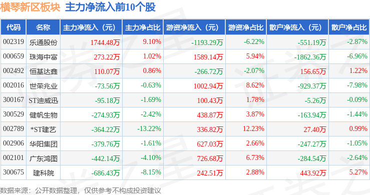 从资金流向上来看,当日横琴新区板块主力资金净流出5.28亿元,游资资金净流入1.41亿元,散户资金净流入3.88亿元。横琴新区板块个股资金流向见下表: