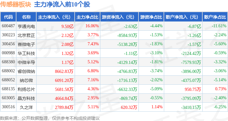 从资金流向上来看,当日传感器板块主力资金净流出22.22亿元,游资资金净流入2050.97万元,散户资金净流入22.01亿元。传感器板块个股资金流向见下表: