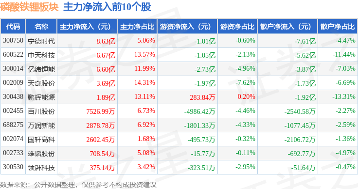 从资金流向上来看,当日磷酸铁锂板块主力资金净流出22.43亿元,游资资金净流入4.66亿元,散户资金净流入17.77亿元。磷酸铁锂板块个股资金流向见下表: