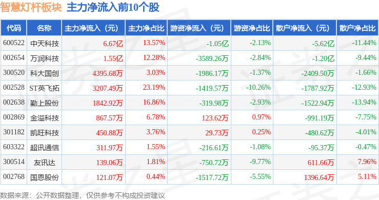 从资金流向上来看,当日智慧灯杆板块主力资金净流入1.96亿元,游资资金净流出4440.61万元,散户资金净流出1.52亿元。智慧灯杆板块个股资金流向见下表: