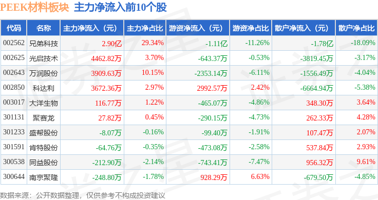 从资金流向上来看,当日PEEK材料板块主力资金净流出5.46亿元,游资资金净流出1.08亿元,散户资金净流入6.54亿元。PEEK材料板块个股资金流向见下表: