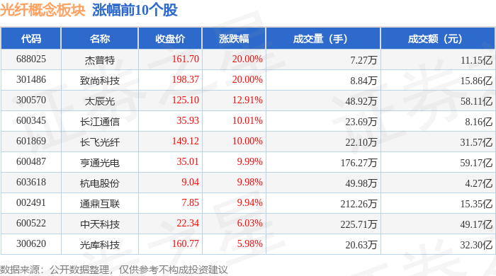 证券之星消息,1月30日光纤概念板块较上一交易日上涨4.43%,杰普特领涨。当日上证指数报收于4117.95,下跌0.96%。深证成指报收于14205.89,下跌0.66%。光纤概念板块个股涨跌见下表:
