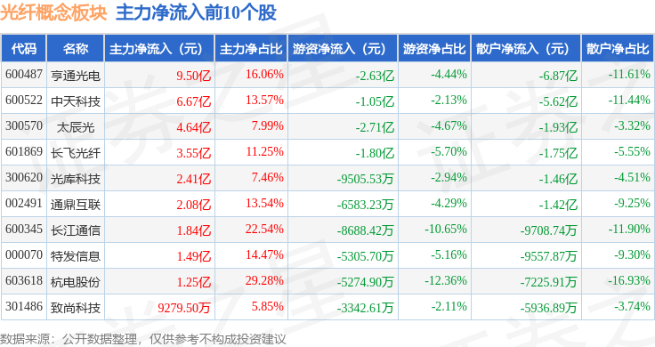 从资金流向上来看,当日光纤概念板块主力资金净流入25.51亿元,游资资金净流出13.0亿元,散户资金净流出12.51亿元。光纤概念板块个股资金流向见下表: