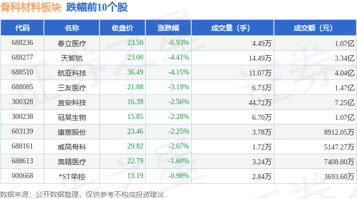 证券之星消息,1月30日骨科材料板块较上一交易日下跌1.85%,春立医疗领跌。当日上证指数报收于4117.95,下跌0.96%。深证成指报收于14205.89,下跌0.66%。骨科材料板块个股涨跌见下表: