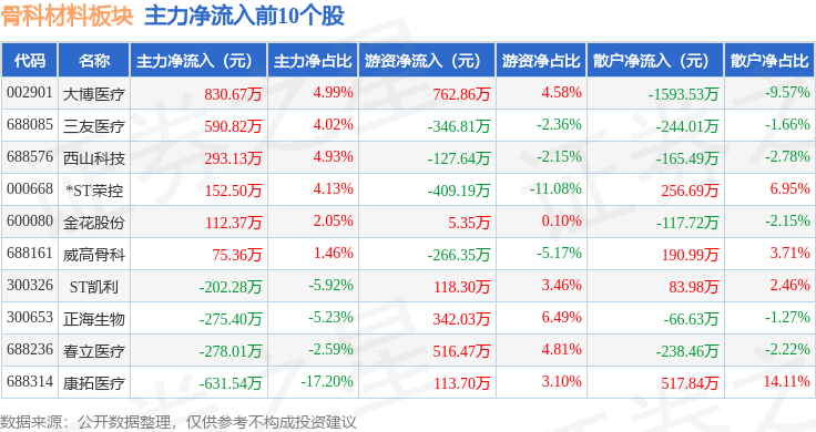 从资金流向上来看,当日骨科材料板块主力资金净流出2.12亿元,游资资金净流入4414.45万元,散户资金净流入1.68亿元。骨科材料板块个股资金流向见下表: