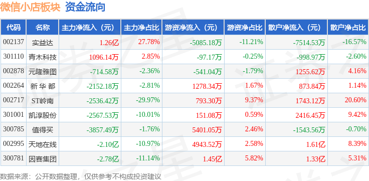 从资金流向上来看,当日微信小店板块主力资金净流出4.69亿元,游资资金净流入2.14亿元,散户资金净流入2.56亿元。微信小店板块个股资金流向见下表: