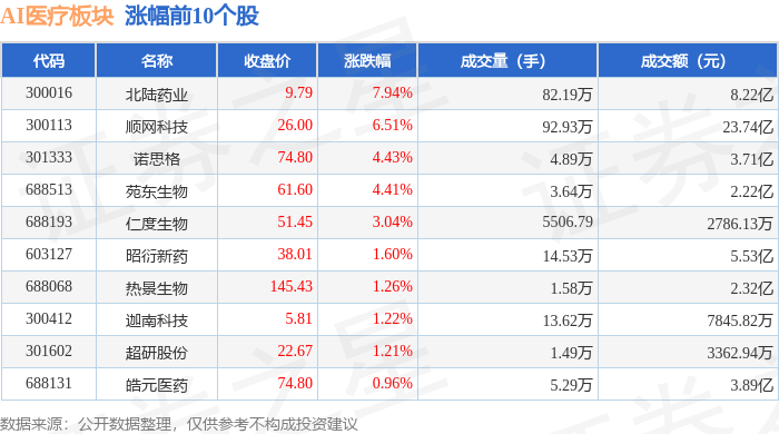从资金流向上来看,当日AI医疗板块主力资金净流出46.64亿元,游资资金净流入6.28亿元,散户资金净流入40.36亿元。AI医疗板块个股资金流向见下表: