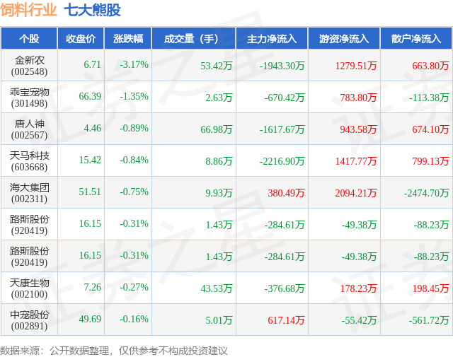 个股表现方面,饲料行业当日领跌股为金新农(002548),该股当日报收6.71,下跌3.17%,成交量53.42万,主力资金净流出1943.3万元。乖宝宠物(301498)以下跌1.35%紧随其后,该股当日成交量2.63万,主力资金净流出670.42万元。除此之外,唐人神(002567)、天马科技(603668)、海大集团(002311)均进入当日熊股之列。具体个股列表见下表: