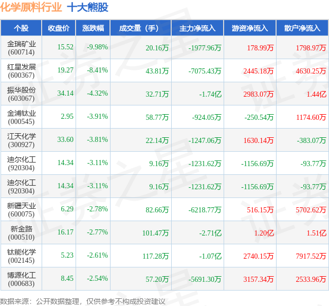 个股表现方面,化学原料行业当日领跌股为金瑞矿业(600714),该股当日报收15.52,下跌9.98%,成交量20.16万,主力资金净流出1977.96万元。红星发展(600367)以下跌8.41%紧随其后,该股当日成交量43.81万,主力资金净流出7075.43万元。除此之外,振华股份(603067)、金浦钛业(000545)、江天化学(300927)均进入当日熊股之列。具体个股列表见下表: