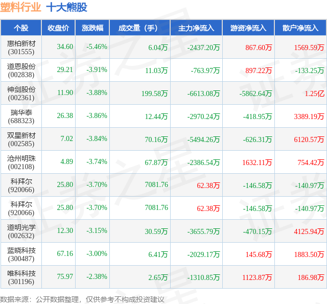 个股表现方面,塑料行业当日领跌股为惠柏新材(301555),该股当日报收34.6,下跌5.46%,成交量6.04万,主力资金净流出2437.2万元。道恩股份(002838)以下跌3.91%紧随其后,该股当日成交量11.03万,主力资金净流出763.97万元。除此之外,神剑股份(002361)、瑞华泰(688323)、双星新材(002585)均进入当日熊股之列。具体个股列表见下表: