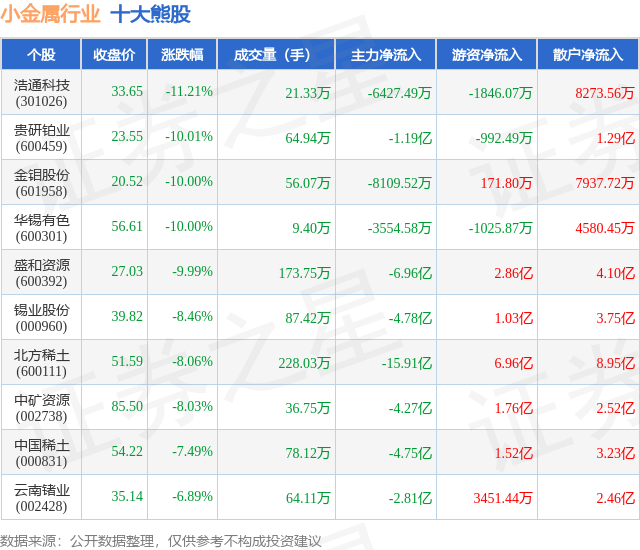 个股表现方面,小金属行业当日领跌股为浩通科技(301026),该股当日报收33.65,下跌11.21%,成交量21.33万,主力资金净流出6427.49万元。贵研铂业(600459)以下跌10.01%紧随其后,该股当日成交量64.94万,主力资金净流出1.19亿元。除此之外,金钼股份(601958)、华锡有色(600301)、盛和资源(600392)均进入当日熊股之列。具体个股列表见下表: