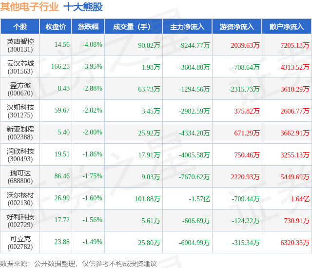 个股表现方面,其他电子行业当日领跌股为英唐智控(300131),该股当日报收14.56,下跌4.08%,成交量90.02万,主力资金净流出9244.77万元。云汉芯城(301563)以下跌3.95%紧随其后,该股当日成交量1.98万,主力资金净流出3604.88万元。除此之外,盈方微(000670)、汉朔科技(301275)、新亚制程(002388)均进入当日熊股之列。具体个股列表见下表: