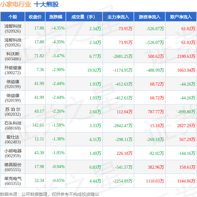 个股表现方面,小家电行业当日领跌股为鸿智科技(920926),该股当日报收17.8,下跌4.35%,成交量2.34万,主力资金净流入73.95万元。鸿智科技(920926)以下跌4.35%紧随其后,该股当日成交量2.34万,主力资金净流入73.95万元。除此之外,科沃斯(603486)、开能健康(300272)、倍益康(920199)均进入当日熊股之列。具体个股列表见下表: