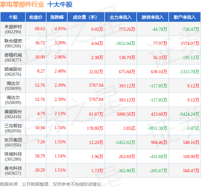 个股表现方面,家电零部件行业当日领涨股为禾盛新材(002290),该股当日报收60.63,上涨4.95%,成交量9.05万,主力资金净流入773.26万元。联合精密(001268)以上涨3.2%紧随其后,该股当日成交量4.04万,主力资金净流出1652.04万元。除此之外,奇精机械(603677)、顺威股份(002676)、海达尔(920699)均进入当日牛股之列。具体个股列表见下表:
