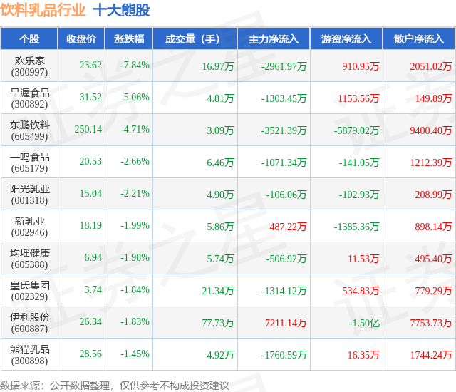 个股表现方面,饮料乳品行业当日领跌股为欢乐家(300997),该股当日报收23.62,下跌7.84%,成交量16.97万,主力资金净流出2961.97万元。品渥食品(300892)以下跌5.06%紧随其后,该股当日成交量4.81万,主力资金净流出1303.45万元。除此之外,东鹏饮料(605499)、一鸣食品(605179)、阳光乳业(001318)均进入当日熊股之列。具体个股列表见下表: