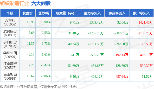 个股表现方面,纺织制造行业当日领跌股为万事利(301066),该股当日报收19.98,下跌3.9%,成交量9.71万,主力资金净流出1389.42万元。航民股份(600987)以下跌2.55%紧随其后,该股当日成交量31.48万,主力资金净流出1256.73万元。除此之外,孚日股份(002083)、华利集团(300979)、江南高纤(600527)均进入当日熊股之列。具体个股列表见下表: