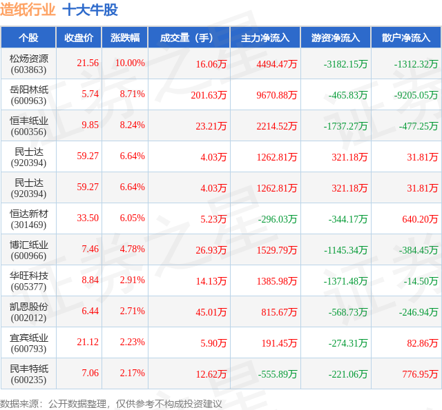个股表现方面,造纸行业当日领涨股为松炀资源(603863),该股当日报收21.56,上涨10.0%,成交量16.06万,主力资金净流入4494.47万元。岳阳林纸(600963)以上涨8.71%紧随其后,该股当日成交量201.63万,主力资金净流入9670.88万元。除此之外,恒丰纸业(600356)、民士达(920394)、民士达(920394)均进入当日牛股之列。具体个股列表见下表: