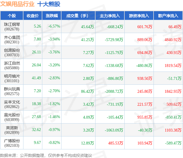 个股表现方面,文娱用品行业当日领跌股为珠江钢琴(002678),该股当日报收5.26,下跌6.57%,成交量45.64万,主力资金净流出668.24万元。齐心集团(002301)以下跌3.94%紧随其后,该股当日成交量41.25万,主力资金净流出5729.98万元。除此之外,创源股份(300703)、浙江自然(605080)、明月镜片(301101)均进入当日熊股之列。具体个股列表见下表: