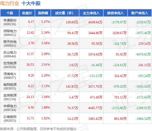 个股表现方面,电力行业当日领涨股为亨通股份(600226),该股当日报收6.17,上涨5.47%,成交量128.69万,主力资金净流入4438.64万元。涪陵电力(600452)以上涨5.34%紧随其后,该股当日成交量99.41万,主力资金净流入3444.8万元。除此之外,惠天热电(000692)、乐山电力(600644)、世茂能源(605028)均进入当日牛股之列。具体个股列表见下表: