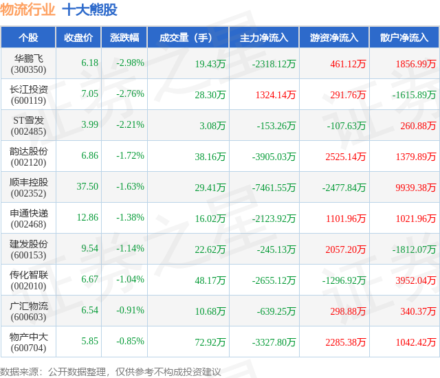 个股表现方面,物流行业当日领跌股为华鹏飞(300350),该股当日报收6.18,下跌2.98%,成交量19.43万,主力资金净流出2318.12万元。长江投资(600119)以下跌2.76%紧随其后,该股当日成交量28.3万,主力资金净流入1324.14万元。除此之外,ST雪发(002485)、韵达股份(002120)、顺丰控股(002352)均进入当日熊股之列。具体个股列表见下表: