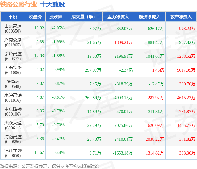 个股表现方面,铁路公路行业当日领跌股为山东高速(600350),该股当日报收10.02,下跌2.05%,成交量8.07万,主力资金净流出352.07万元。招商公路(001965)以下跌1.99%紧随其后,该股当日成交量21.65万,主力资金净流入1809.24万元。除此之外,宁沪高速(600377)、大秦铁路(601006)、深高速(600548)均进入当日熊股之列。具体个股列表见下表: