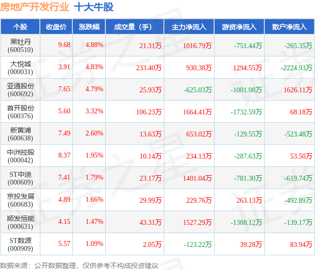 个股表现方面,房地产开发行业当日领涨股为黑牡丹(600510),该股当日报收9.68,上涨4.88%,成交量21.31万,主力资金净流入1016.79万元。大悦城(000031)以上涨4.83%紧随其后,该股当日成交量233.4万,主力资金净流入930.38万元。除此之外,亚通股份(600692)、首开股份(600376)、新黄浦(600638)均进入当日牛股之列。具体个股列表见下表: