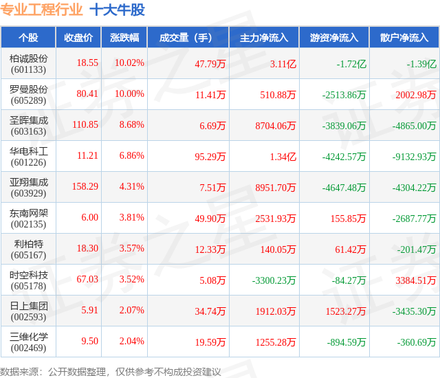 个股表现方面,专业工程行业当日领涨股为柏诚股份(601133),该股当日报收18.55,上涨10.02%,成交量47.79万,主力资金净流入3.11亿元。罗曼股份(605289)以上涨10.0%紧随其后,该股当日成交量11.41万,主力资金净流入510.88万元。除此之外,圣晖集成(603163)、华电科工(601226)、亚翔集成(603929)均进入当日牛股之列。具体个股列表见下表:
