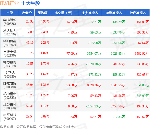 个股表现方面,电机行业当日领涨股为华瑞股份(300626),该股当日报收20.32,上涨4.9%,成交量14.64万,主力资金净流出12.71万元。通达动力(002576)以上涨2.48%紧随其后,该股当日成交量4.99万,主力资金净流出59.63万元。除此之外,华阳智能(301502)、方正电机(002196)、神力股份(603819)均进入当日牛股之列。具体个股列表见下表:
