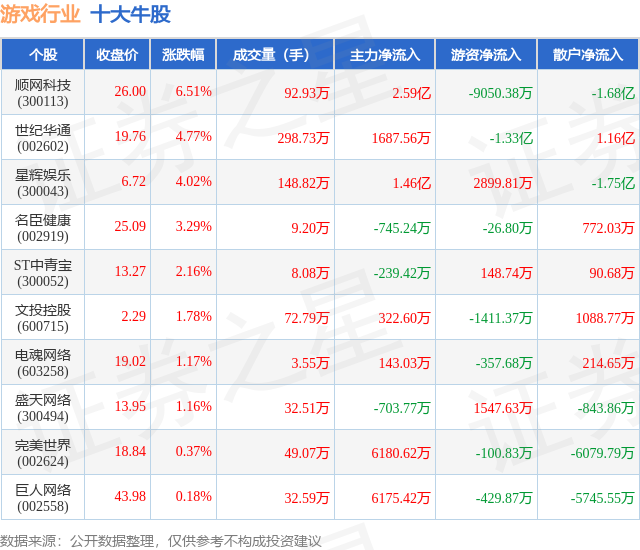 个股表现方面,游戏行业当日领涨股为顺网科技(300113),该股当日报收26.0,上涨6.51%,成交量92.93万,主力资金净流入2.59亿元。世纪华通(002602)以上涨4.77%紧随其后,该股当日成交量298.73万,主力资金净流入1687.56万元。除此之外,星辉娱乐(300043)、名臣健康(002919)、ST中青宝(300052)均进入当日牛股之列。具体个股列表见下表: