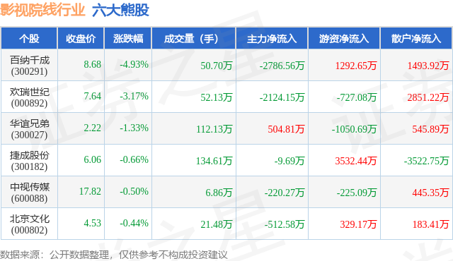 个股表现方面,影视院线行业当日领跌股为百纳千成(300291),该股当日报收8.68,下跌4.93%,成交量50.7万,主力资金净流出2786.56万元。欢瑞世纪(000892)以下跌3.17%紧随其后,该股当日成交量52.13万,主力资金净流出2124.15万元。除此之外,华谊兄弟(300027)、捷成股份(300182)、中视传媒(600088)均进入当日熊股之列。具体个股列表见下表: