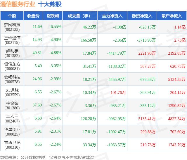 个股表现方面,通信服务行业当日领跌股为梦网科技(002123),该股当日报收11.69,下跌6.55%,成交量46.22万,主力资金净流出1.08亿元。三维通信(002115)以下跌4.9%紧随其后,该股当日成交量166.58万,主力资金净流出2.36亿元。除此之外,蜂助手(301382)、恒信东方(300081)、会畅科技(300578)均进入当日熊股之列。具体个股列表见下表: