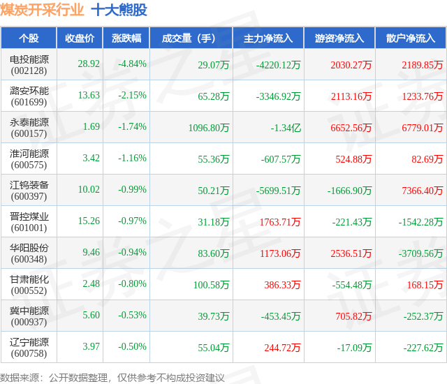 个股表现方面,煤炭开采行业当日领跌股为电投能源(002128),该股当日报收28.92,下跌4.84%,成交量29.07万,主力资金净流出4220.12万元。潞安环能(601699)以下跌2.15%紧随其后,该股当日成交量65.28万,主力资金净流出3346.92万元。除此之外,永泰能源(600157)、淮河能源(600575)、江钨装备(600397)均进入当日熊股之列。具体个股列表见下表: