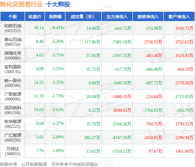 个股表现方面,炼化及贸易行业当日领跌股为和顺石油(603353),该股当日报收36.14,下跌8.41%,成交量14.06万,主力资金净流出641.72万元。泰山石油(000554)以下跌5.26%紧随其后,该股当日成交量117.86万,主力资金净流出7481.18万元。除此之外,渤海化学(600800)、宝利国际(300135)、统一股份(600506)均进入当日熊股之列。具体个股列表见下表: