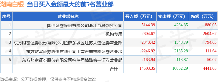 证券小知识:龙虎榜是交易所披露的竞价交易公开信息,现身龙虎榜的个股都是当日最为活跃的个股,是投资者日常重点关注的数据。交易所公布当日买入金额和卖出金额前五名的席位,其中一些席位代表特殊意义,如机构专用席位是指基金专用席位、券商自营专用席位、社保专用席位、券商理财专用席位、保险机构专用席位、保险机构租用席位、QFII专用席位等机构投资者买卖证券的专用通道和席位。深股通专用、沪股通专用为北向资金的交易席位。